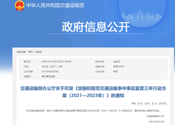 其中,在“公路管理领域事中事后监管三年行动工作任务”当中:1、强化货车违法超限超载监管2、强化大件运输许可监管(详情链接:交通部发文:加强交通运输事中事后监管)